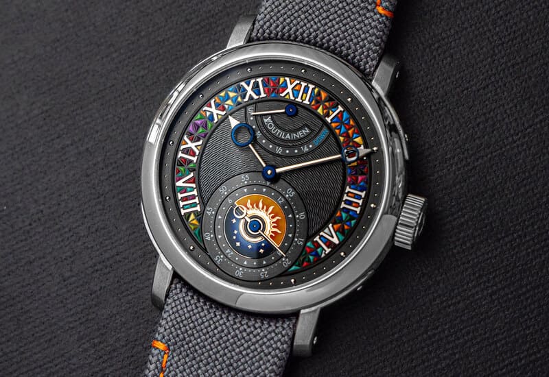 Setiap dial memerlukan waktu pengerjaan selama 32 jam untuk melukis 28 warna berbeda. Ditambah delapan jam proses pemanasan di dalam kiln. Penunjuk siang/malam pada jam ini memiliki ukiran dan enamel manual berwarna safron dan biru, yang secara halus menyisipkan motif bunga monogram khas Louis Vuitton. Kolaborasi antara Louis Vuitton dan Voutilainen ditandai dengan logo kedua merek yang terpampang indah di dial. Jam ini empertegas identitas unik dari jam tangan ini.